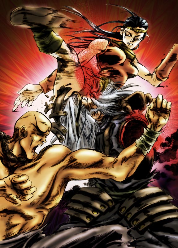 必殺の拳と蹴りが、かつての師の頭部を砕いた。
