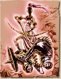 長い髪を高く結い上げ、金色の弓を手挟んだ背の高い女。