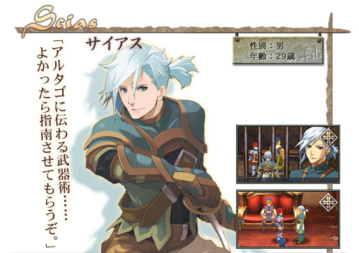 《アルタゴの鷹》の異名を持つ竜騎士団の千竜長。 ロムン帝国との戦いで獅子奮迅の働きを見せ、紛争終結に一役買った。男らしい凛々しさと面倒見の良い性格を兼ね備えており、街でも人気がある。アルタゴに到着したばかりのアドルとドギに、アルタゴ流武術を指南してくれる。