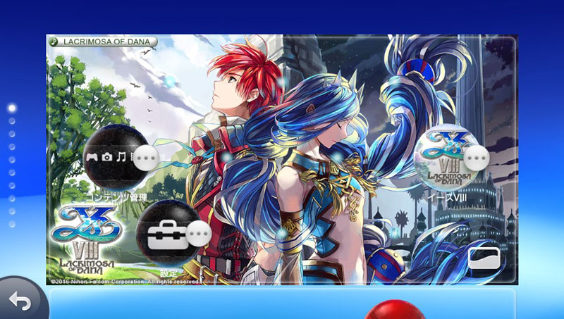 | 1)PS Vitaを起動しホームにある「イースVIII」のゲームアイコンをタップしてLiveArea™画面を開いてください。 |