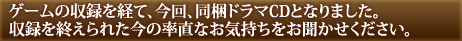 | 「イース」シリーズの25周年記念作品ということで、スタッフさん、キャストのみなさんの想いがたくさん詰まった作品となっています!ゲーム、CDドラマで、「イース セルセタの樹海」の魅力をより知っていただけたら嬉しいです! |