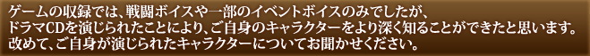 自分が演じさせて頂いたキャラクターだけでなく、他のキャラクターのことを知る事が出来たり、作品の世界観に浸ることが出来て楽しかったです。 |