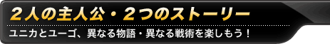 『イース・オリジン』の主人公、ユニカとユーゴ。2人にはそれぞれ異なるストーリーが用意されています。両方のキャラをプレイして、全てのストーリーを楽しもう! また、それぞれ攻撃方法や習得する“スキル”が異なるので、キャラクターによって戦術が全く違うアクションが楽しめます。