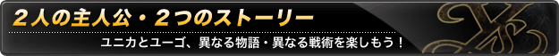 2人の主人公、ユニカとユーゴには、それぞれ異なるストーリーが用意されています。ユニカとユーゴは性格も境遇も全く異なるキャラクター。「失踪した女神の探索」という同じ目的を持っていても、2つストーリーは違った視点、違った展開で進んでいきます。