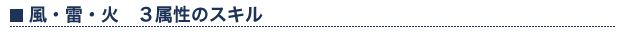 冒険中に「蒼空の翼」(風)、「紫電の戦槌」(雷)、「紅蓮の大剣」(火)を入手すると、風、雷、火の属性を持つ技「スキル」を使用できるようになります。3種類のスキルは戦闘中いつでも切り替えキーで変更することが出来ます。