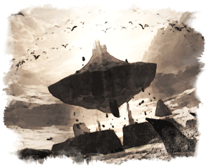 魔物たちの軍勢が押し寄せる中、女神と六神官は《黒真珠》の力を使った儀式を執り行い、サルモン神殿の一帯を天空に浮上させるという奇蹟を起こした。その際、時間を稼ぐため地上に残った者たちがいると伝えられている。 |