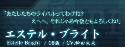 前作「英雄伝説・空の軌跡」の主人公。 元気一杯で突っ走りがちな性格だったが、目覚ましいほどの成長を遂げ、若いながらもエース級の実力の遊撃士としてクロスベル支部に迎えられた。 ロイドたちにとっては手強く格上のライバルだが、本人にその意識は余り無い。