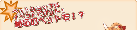 ペットはペットショップで買ったり、イベントで手に入れたりします。冒険中は、ペットの中から1匹を選んで冒険に連れて歩くことができます。連れて歩くペットは冒険中いつでも切り替え可能です。