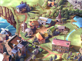 ピピロとポックルの住む村。住民30人前後のとても小さな村で、アルジェスで唯一、人が住んでいる場所でもあります。周辺の豊かな自然の恵みが自給自足の生活を可能にしており、村人たちは女神アプリエスを奉ずる教会を中心に、家族同然に助け合いながら平和に暮らしています。島の外との交流は、半年に1度訪れる飛行機に頼っていますが、たまに観光客や交易商人、そしてトレジャーハンターが飛行機をチャーターしてやってくることもあります。
